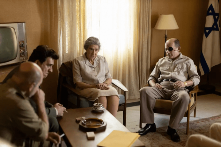 是的,整部电影的大部分篇幅,都是借由梅尔在听证会上陈述的证词,来溯源关键的二十天内,身为国家总理的她,到底做了哪些“好事”,好挽救那个摇摇欲坠、亡国边缘的以色列。就从这场戏开始,全片绝大多数的时间,都是在一个又一个阴暗窘迫的小房间里进行,比方总理官邸的会客室、应变中心的战情室、总理办公室……辅以特别调色的晦暗滤镜,还有重低音和段促节奏为主的情境配乐,在在都是为了将观众一起带入和梅尔身处环境相同的沉重压抑氛围。
